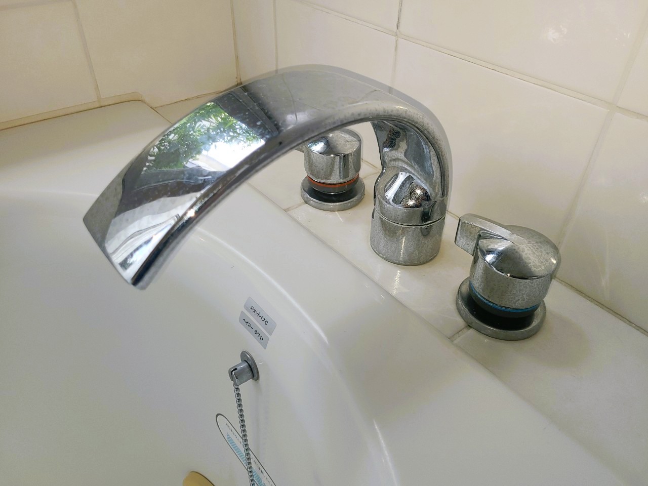 新しい浴槽用水栓を水平器で計測しながら取付けます