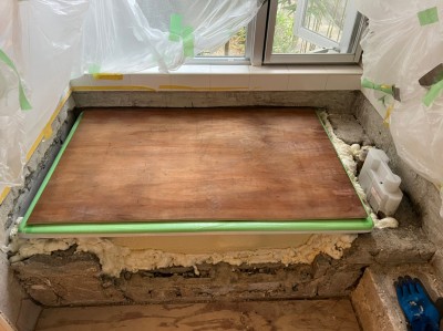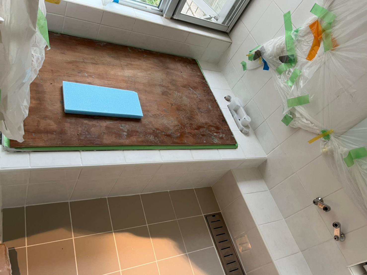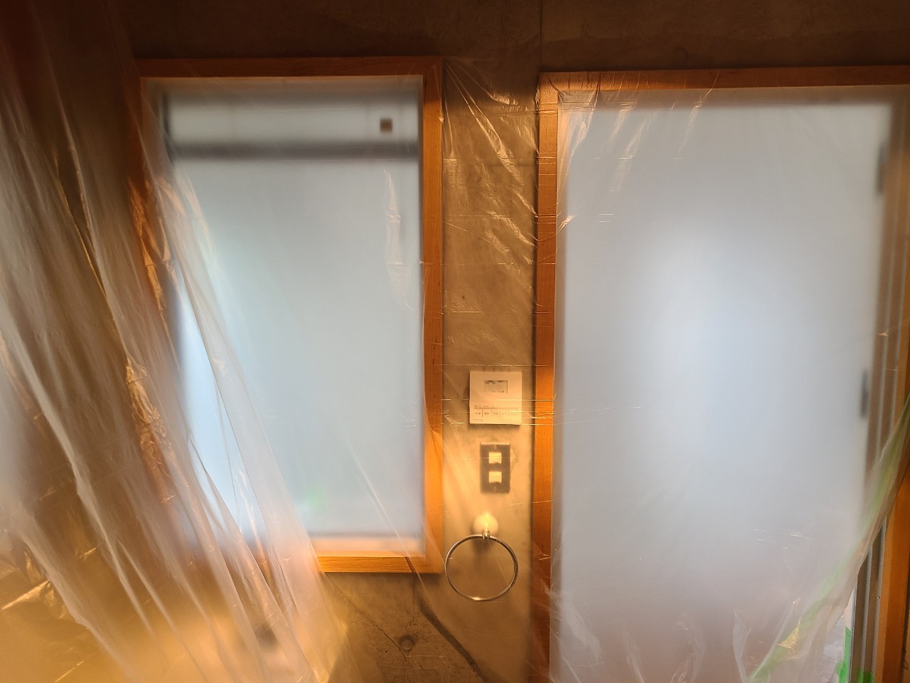 床のタイルは残すので、養生シート・ビニール・コンパネを敷き傷つけないようにしておきます