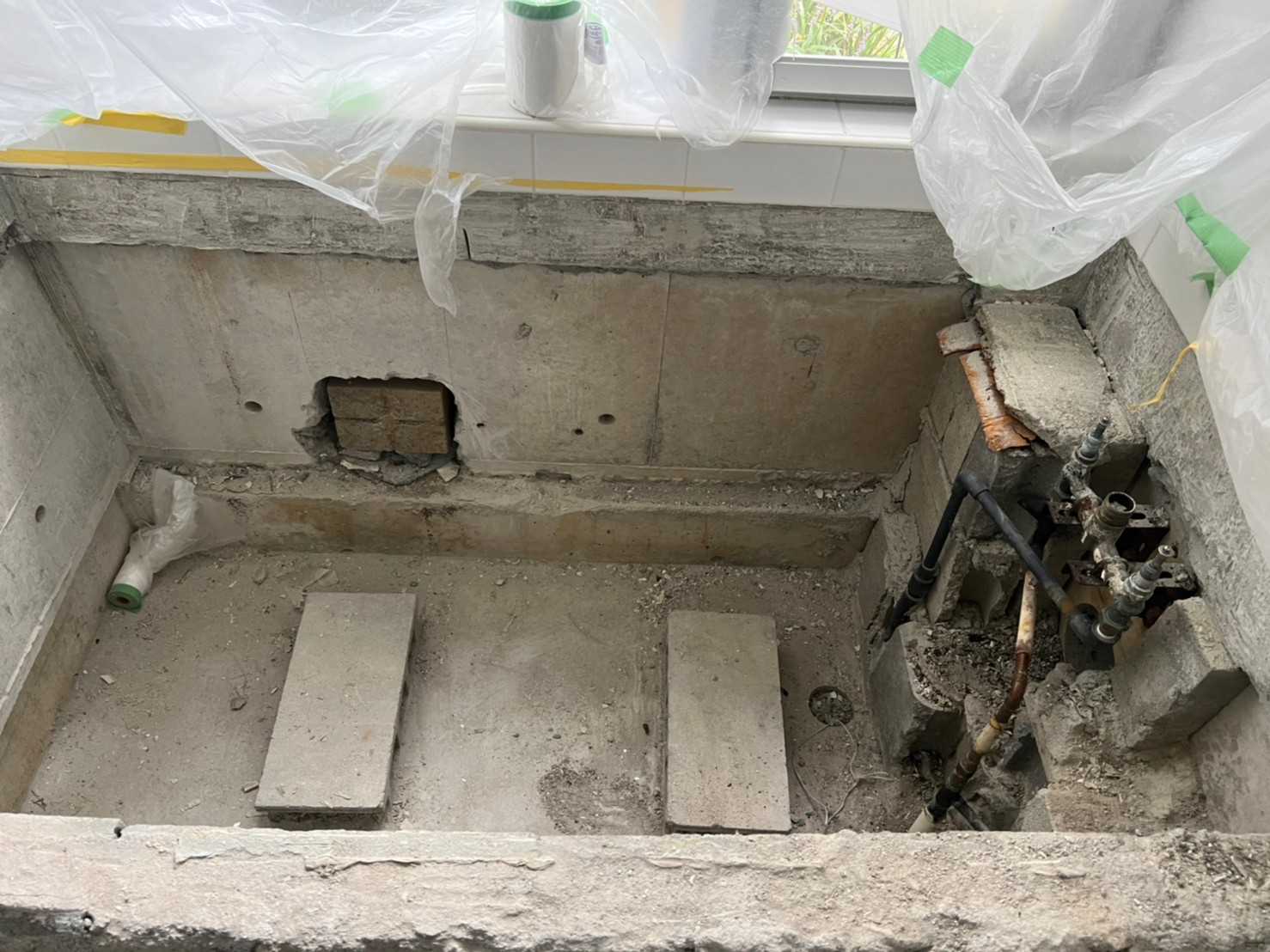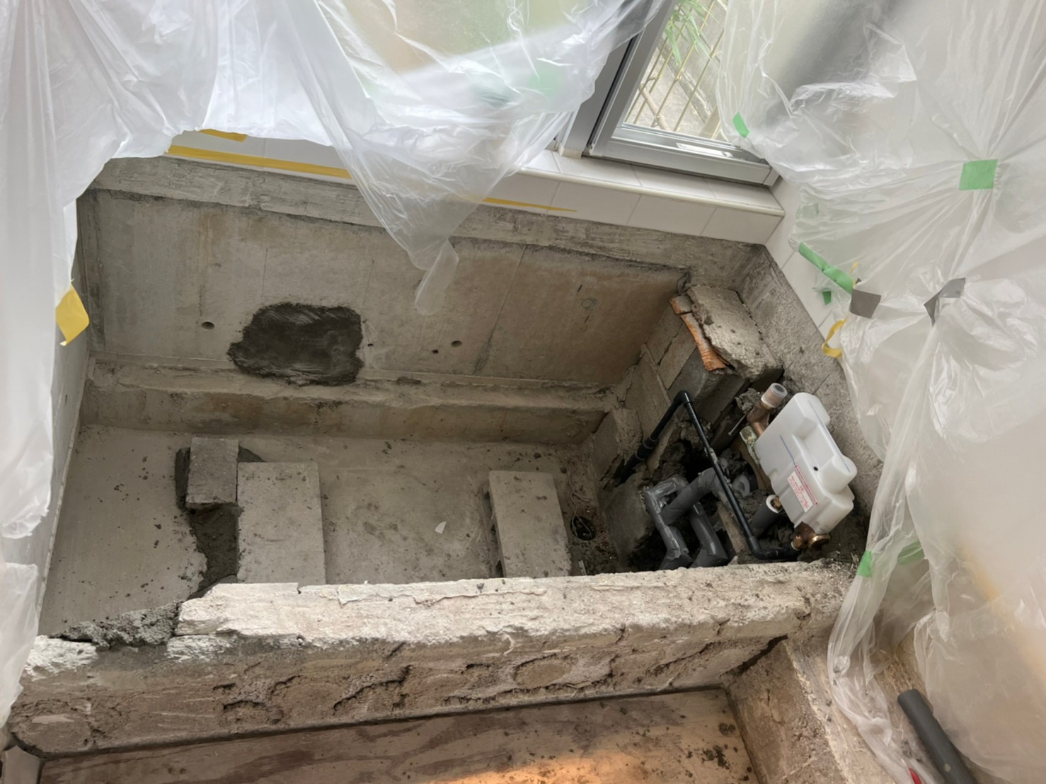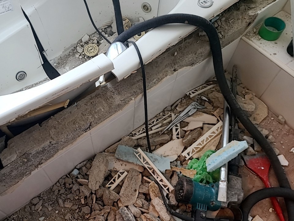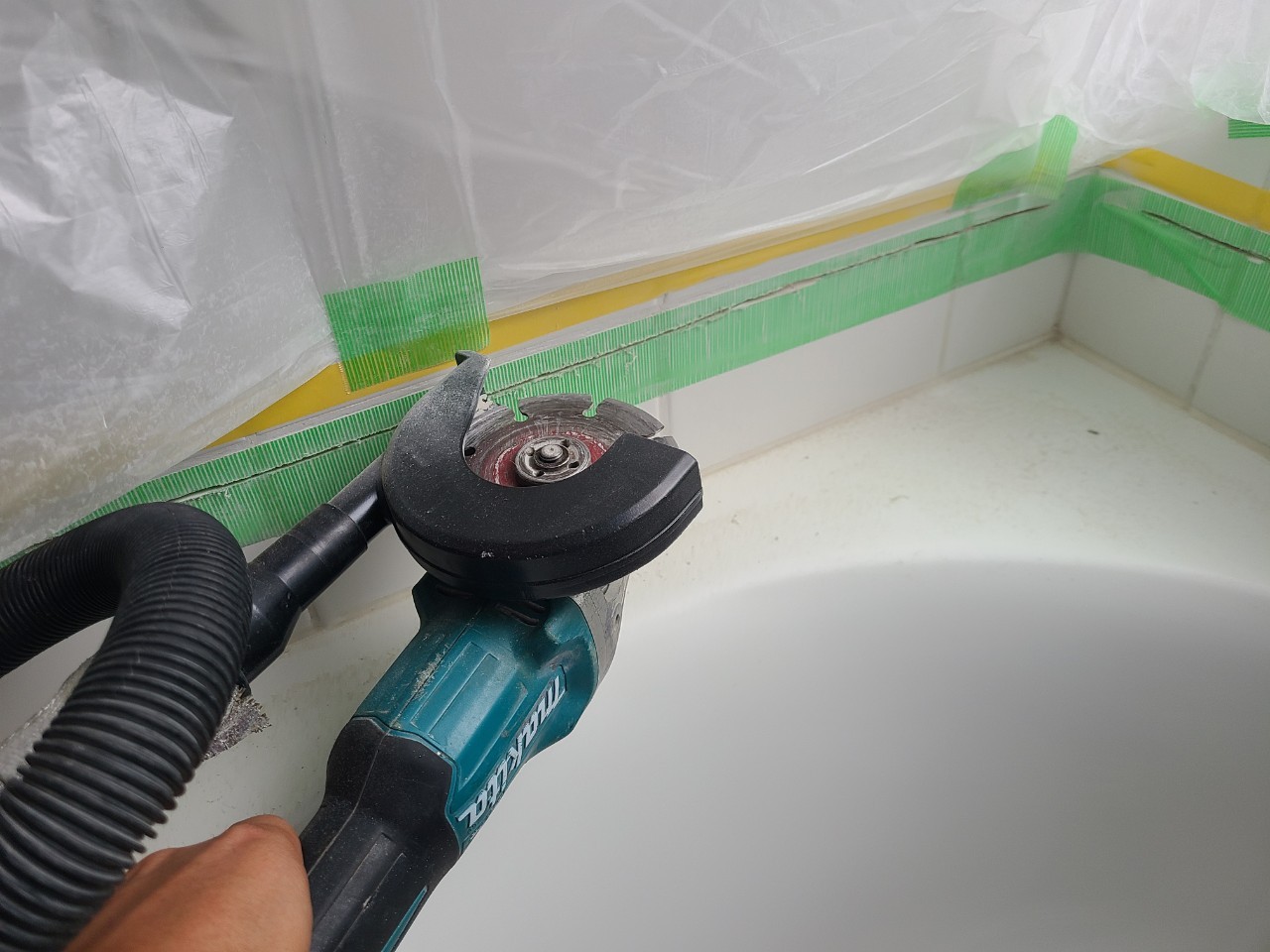 浴槽を撤去するために電動カッターでタイルをカットしていきます