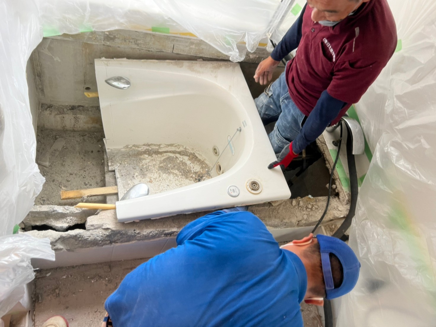 タイルと浴槽を切り離せたら、浴槽を2つにカットし浴室から撤去します