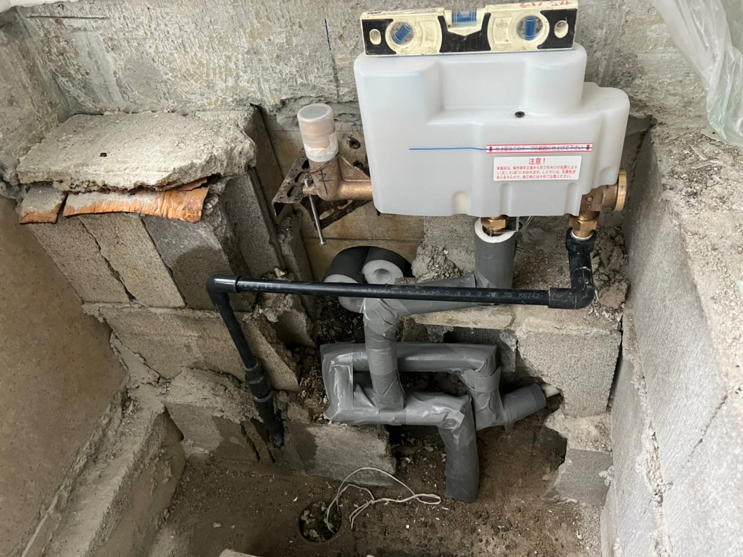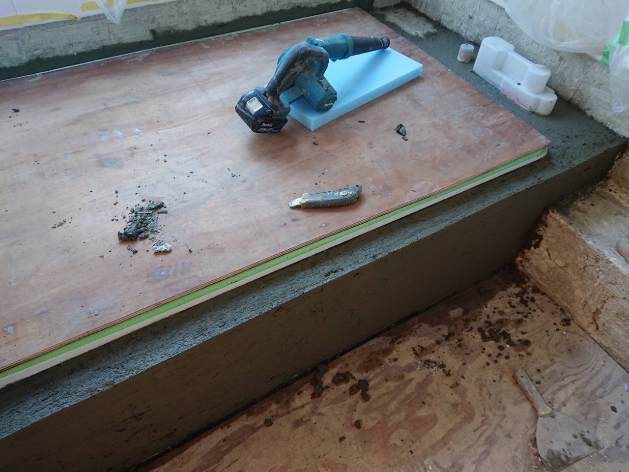 結露防止効果のある発砲ウレタンを充填(じゅうてん)し、浴槽を設置。ゴミが入らないようにコンパネで蓋をしておきます