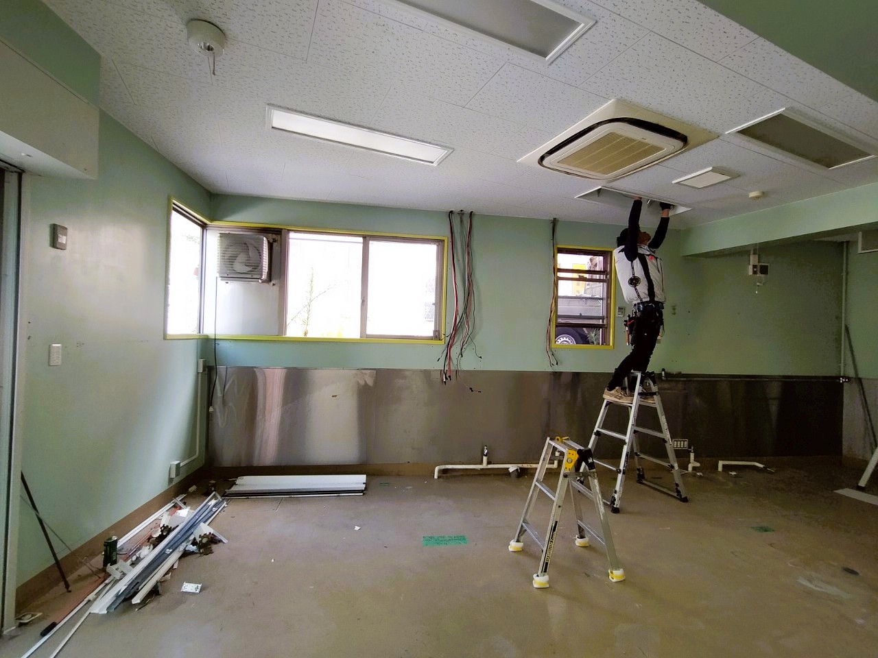 既存の蛍光灯はカバーと共に撤去し、天井用化粧せっこうボード(ジプトーン)も撤去します。