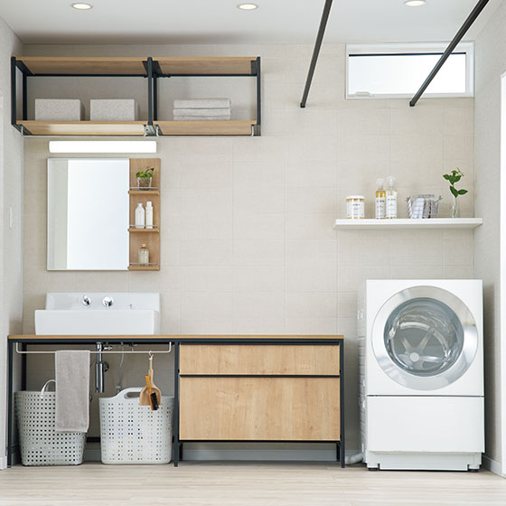 ランドリールームは、ファミリークローゼット(ファミクロ)と隣接させることでより効率的に使用できます。洗濯物をたたんで、そのまま収納できるため、持ち運びの手間が減り、家事にかかる時間を短縮することができます。
